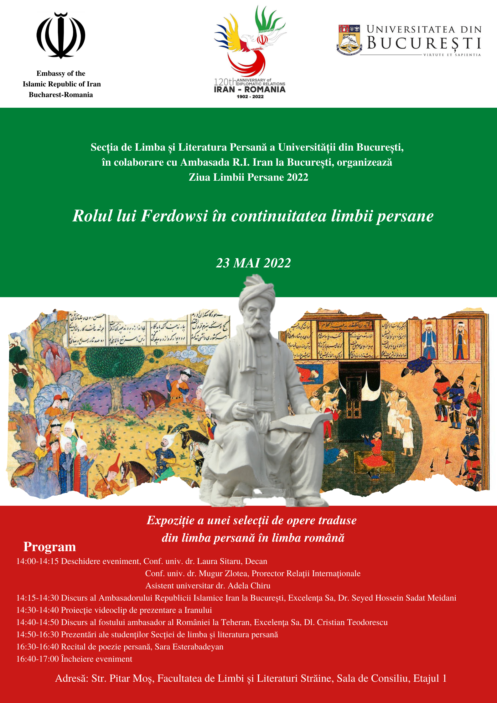 Cu ocazia celebrării Zilei limbii și culturii persane, Ambasada Republicii Islamice Iran, în colaborare cu Universitatea din București, organizează  Ziua limbii persane. Evenimentul va avea loc luni, 23 mai 2022 la Universitatea din București și va include o expoziție a unor opere traduse din limba persană în limba română, precum și câteva prezentări a literaturii persane.