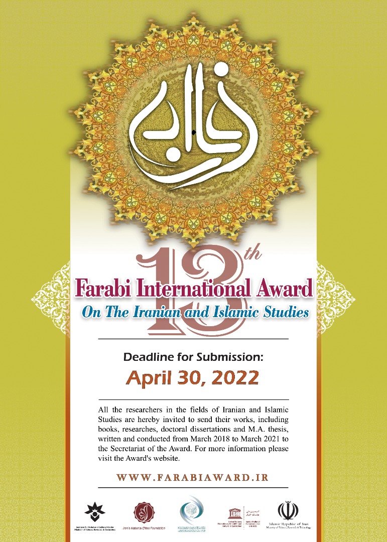 Farabi International Award, which is specifically aimed at the development of Islamic Humanities is held by the Ministry of Science, Research and Technology on an annual basis. With its goals being specified in both theoretical and applied fields, the Award has been organizationally defined in a way that enables it to receive the highest amount of support from research and educational organizations active in the field of Humanities. With this purpose in mind, the valuable experiences of Iran’s international festivals and the views and proposals provided by academies and research and scientific institutions were taken into consideration and used in designing the Award. In addition to that, all scientific and research seminaries and universities were invited to participate in the Award’s policy-making process, making up a comprehensive effort and collective action to identify and appreciate the selected works of Islamic Humanities. The Award receives, reviews, and chooses the selected works at the two young (under 35 years) and adult levels and, in terms of territory, covers both domestic and foreign areas. Where the domestic area is concerned, all the works produced by Iranians, regardless of their current location and profession, are considered, while the foreign area covers works produced by those who do not have an Iranian nationality.
